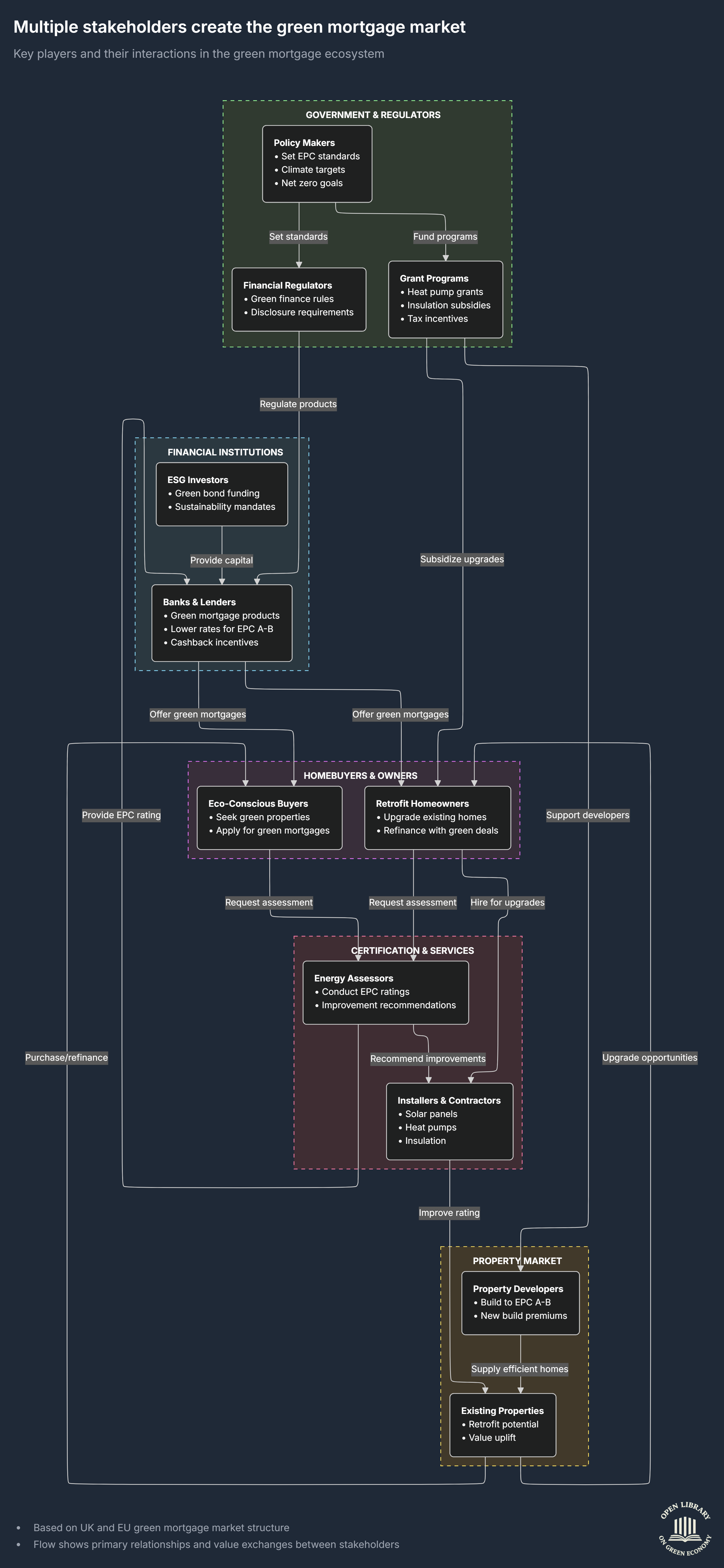 This chart explains how the green mortgage market actually works by showing all the different players involved and how they interact. A green mortgage isn’t created by a single bank decision. It’s the result of coordinated activity between governments, regulators, lenders, homeowners, installers, certifiers, and property developers. The flow makes it clear that the entire ecosystem has to function together for the market to succeed.