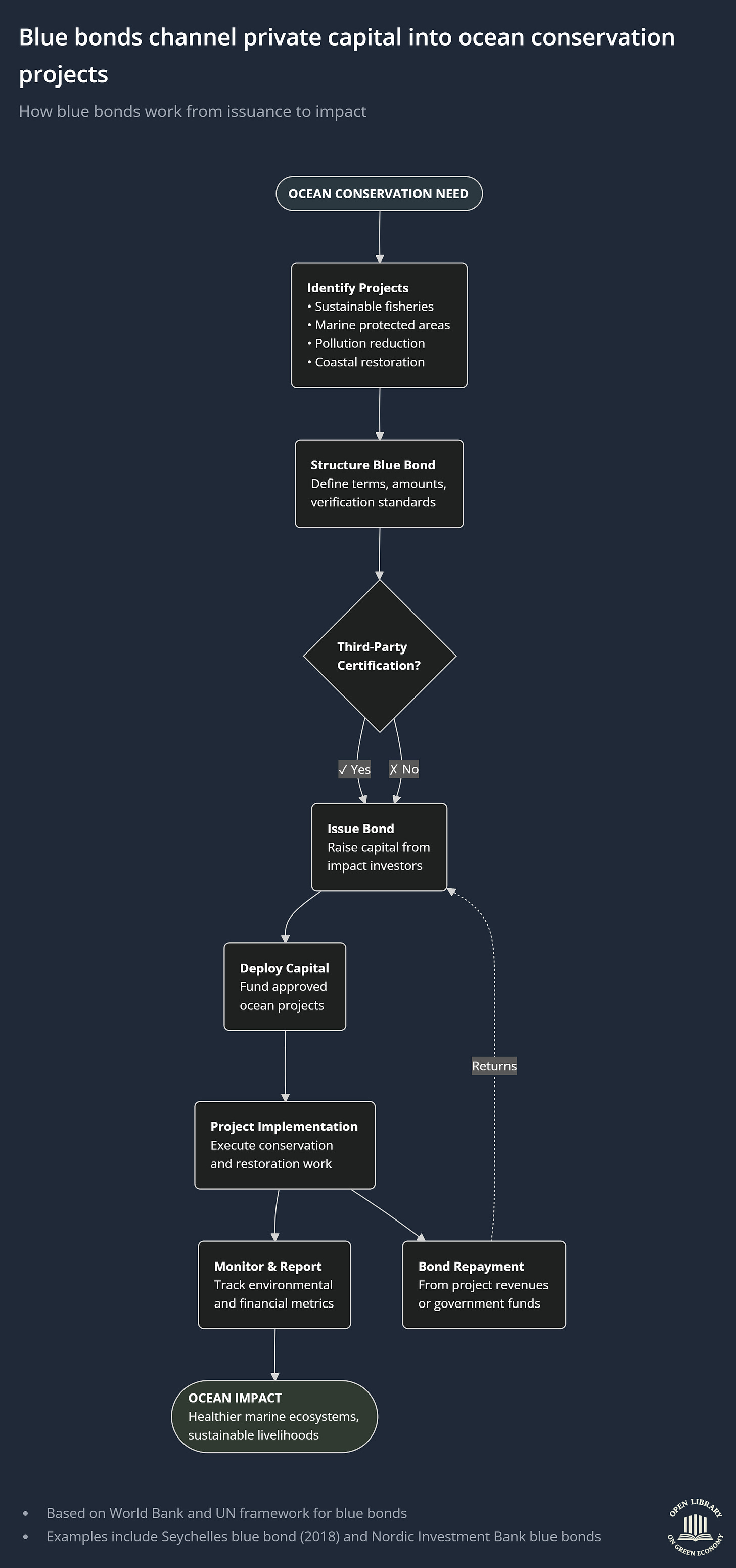 This chart explains how blue bonds are used to move private capital into ocean conservation in a structured and credible way. It shows the full journey from identifying an ocean problem to delivering real environmental impact while still repaying investors.