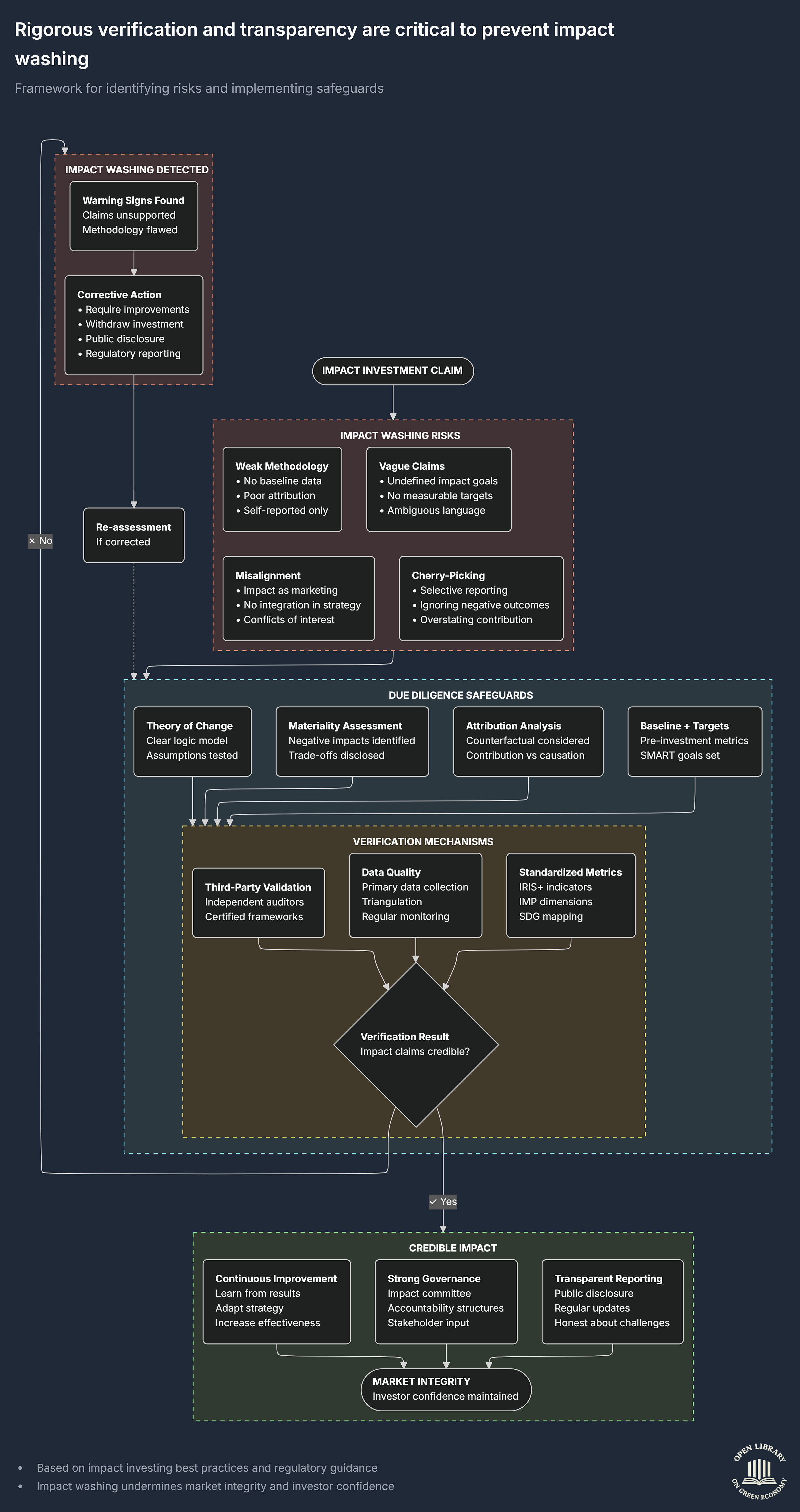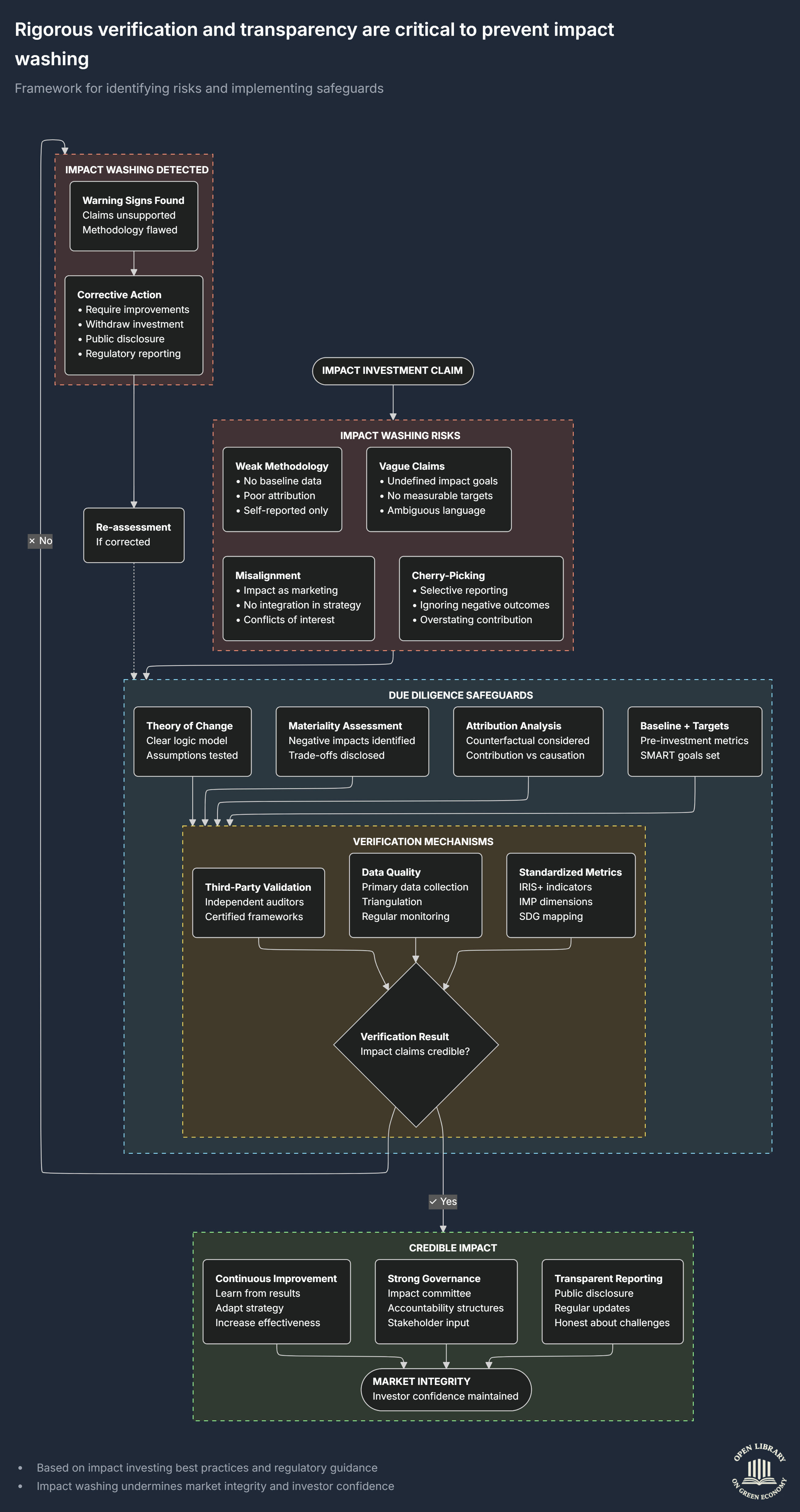 This chart explains how investors, regulators, and fund managers can prevent impact washing, which happens when an investment claims to create positive social or environmental impact but cannot actually prove it. The chart shows the risk signals, the safeguards, and the verification steps needed to ensure that any stated impact is credible.