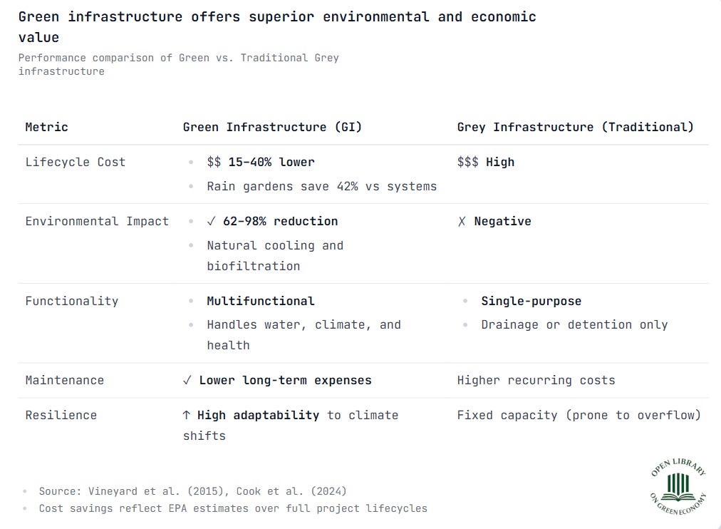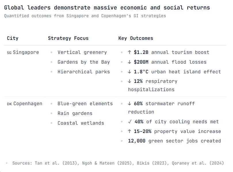 Excellent overview. The Singapore case study really underscores how multifunctionality drives ROI in land-constrained contexts. What stood out for me was the nonlinear cooling effect you mentioned with tree canopy coverage—that threshold dynamic completely changes the calculus for GI investment priorities. The governance deficit issue in cities like Melbourne seems like the real bottleneck tho, since even optimal designs fail without coordinated policy frameworks.